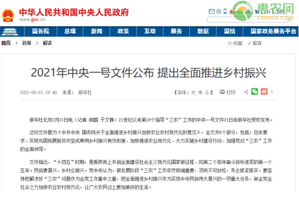 2021年中央一号文件公布 提出全面推进乡村振兴