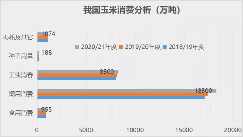 近年来,受益于居民消费水平的提升以及下游饲料和深加工行业快速发展,国内玉米总消费量持续上涨。2020/2021年度饲料行业玉米消费量达到18500万吨,同比增加6.32%;深加工行业玉米消费量在8200万吨,同比稳定。