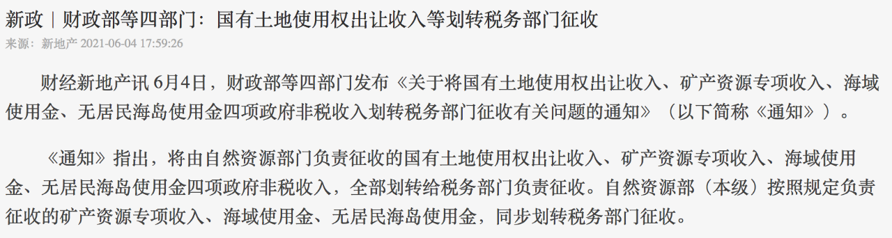6月4日,财政部等四部门发布《关于将国有土地使用权出让收入、矿产资源专项收入、海域使用金、无居民海岛使用金四项政府非税收入划转税务部门征收有关问题的通知》(以下简称《通知》)。