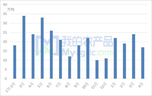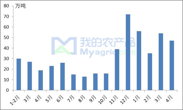 进口:国外大米价格优势仍较为明显,我国大米进口量继续增加,1月-4月我国累计进口大米192万吨,同比增加155.2%,自11月开始,我国进口数量急剧增加,大米进口数量的增加,给国内大米市场带来一定压力。