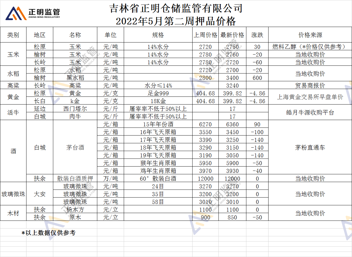 2022年5月第一周押品价格