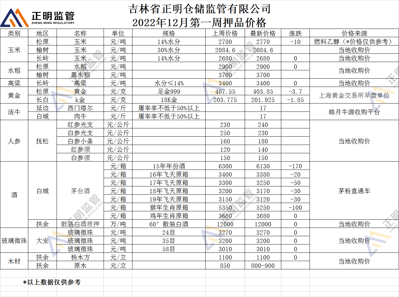 2022年12月第一周押品价格