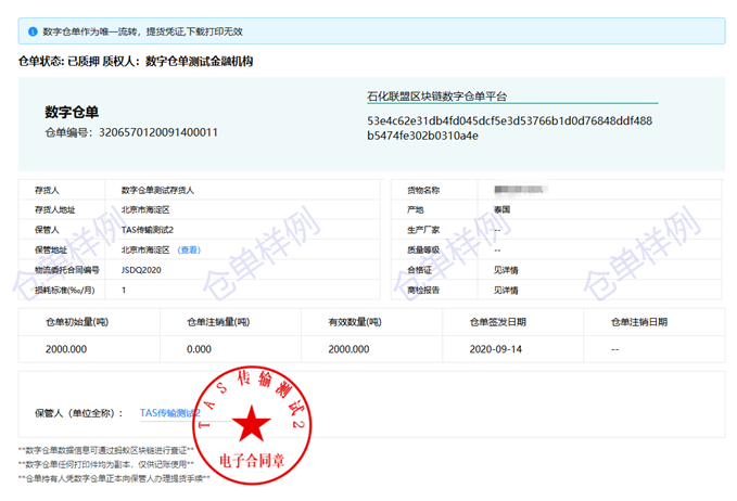 中化能源科技区块链数字仓单平台开具的数字仓单