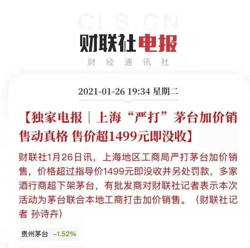 昨日,据财联社消息,上海地区工商局严打茅台加价销售,价格超过指导价1499元即没收并另处罚款,多家酒行商超下架茅台,有批发商对财联社记者表示本次活动为茅台联合本地工商打击加价销售。