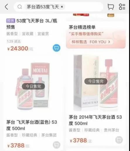 目前上海地区已难觅飞天茅台的踪迹。1月26日近21点,盒马页面显示,2016年53度500ml的飞天茅台酒售价为4299元,2019年的售价为3699元,均为明日送达;但不到1个小时后,记者发现,盒马已下架了相关产品。