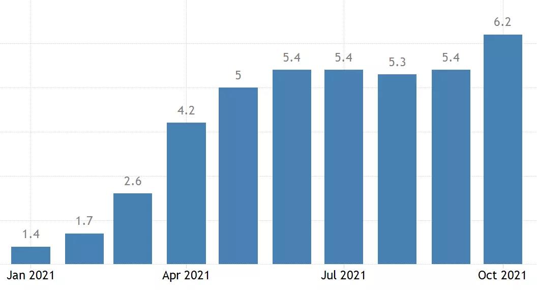 从下图数据上来看,10月底美国消费者价格指数(CPI)单月飙升6.2%,创下近30年来的单月上涨最大幅度。而今年以来,几乎所有的单月增幅都高于5%,通胀情形不得不需要人警惕。上一次美国社会经历如此高的通胀还要追溯到海湾战争初期。食品和能源价格的巨大涨幅成为此次美国通货膨胀的动力。