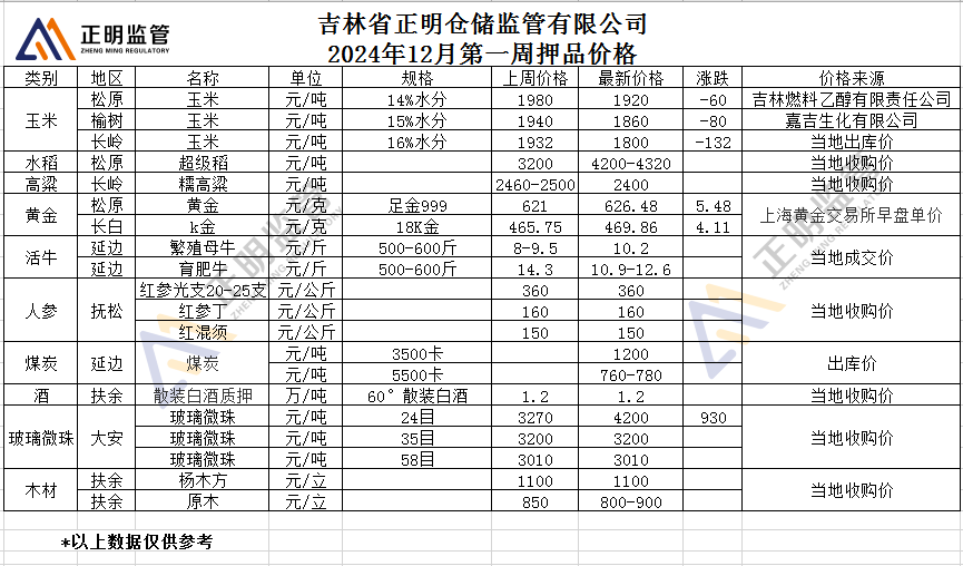 2024年12月第一周押品价格